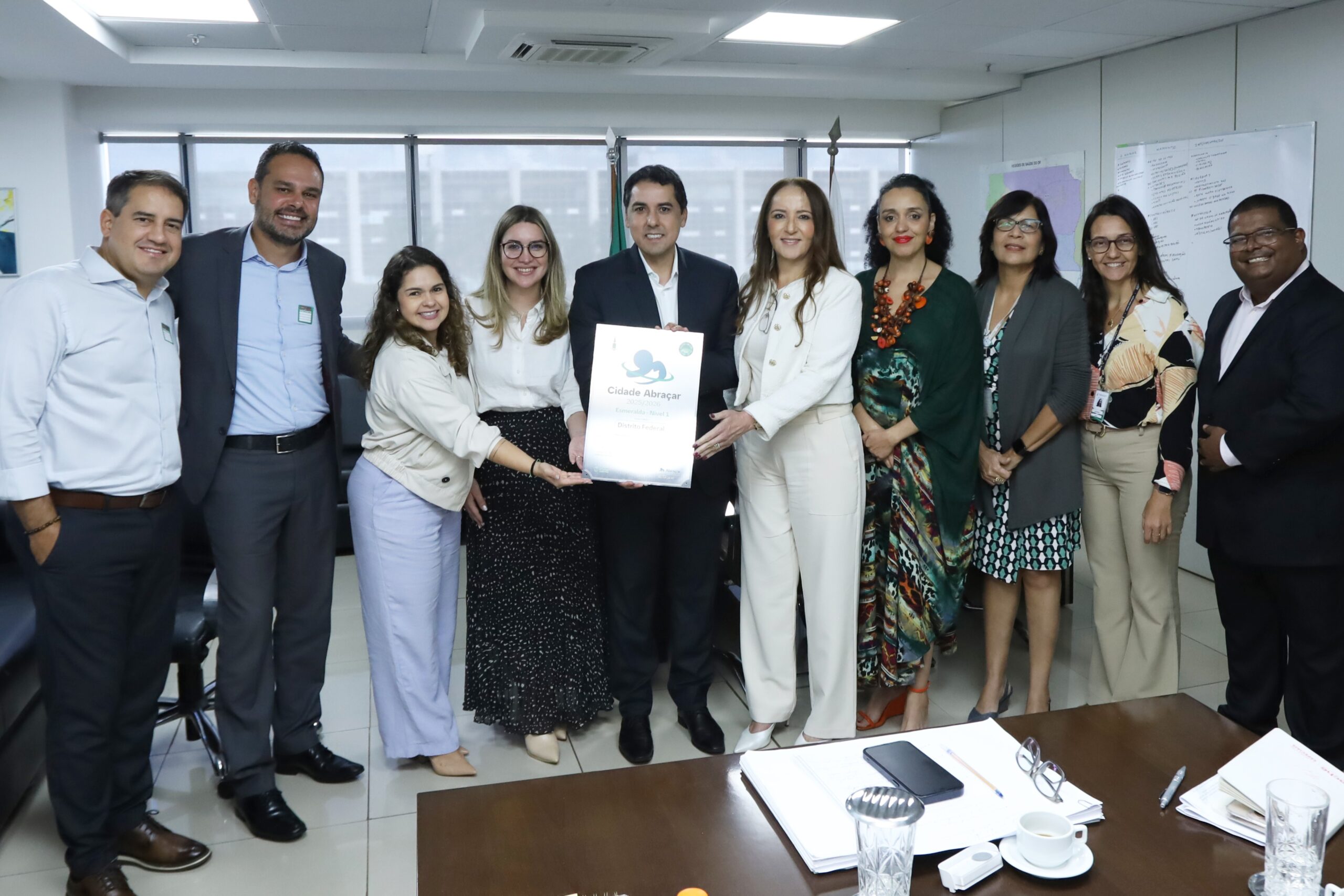 O Governo do Distrito Federal (GDF) foi agraciado com o selo Esmeralda do programa “Cidade Abraçar”, uma certificação que evidencia o fortalecimento da Atenção Primária no diagnóstico e no atendimento a pacientes com doenças respiratórias. A entrega da placa de reconhecimento ocorreu na última segunda-feira (26), nas dependências da Secretaria de Saúde (SES-DF).
