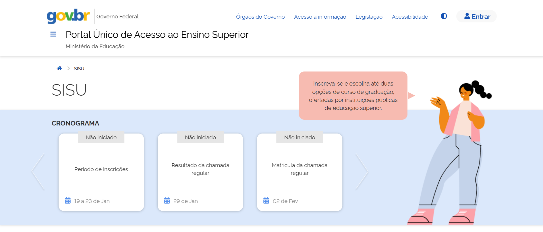 As inscrições para o Sisu terão início no dia 19 de janeiro e seguirão até o dia 23 do mesmo mês. Os interessados poderão se inscrever exclusivamente pelo Portal Único de Acesso ao Ensino Superior. As notas a serem utilizadas para a seleção são as do Exame Nacional do Ensino Médio (Enem), aceitando as edições de 2023, 2024 e 2025. As vagas oferecidas neste ano letivo serão disponibilizadas apenas neste único processo seletivo, permitindo até duas opções de cursos. Os resultados saem no portal do Sisu no dia 29 de janeiro.